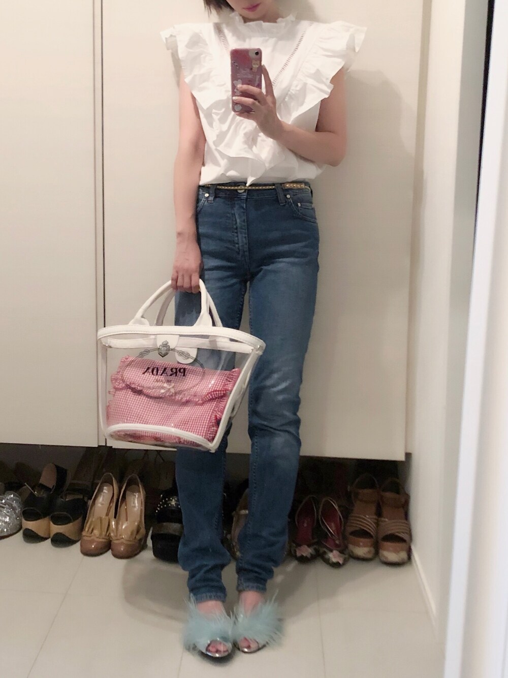 夏らしい気分になるとブルーデニム履きたくなる!L.Aで買ったお気に入り! クリアバッグにフェザー♡