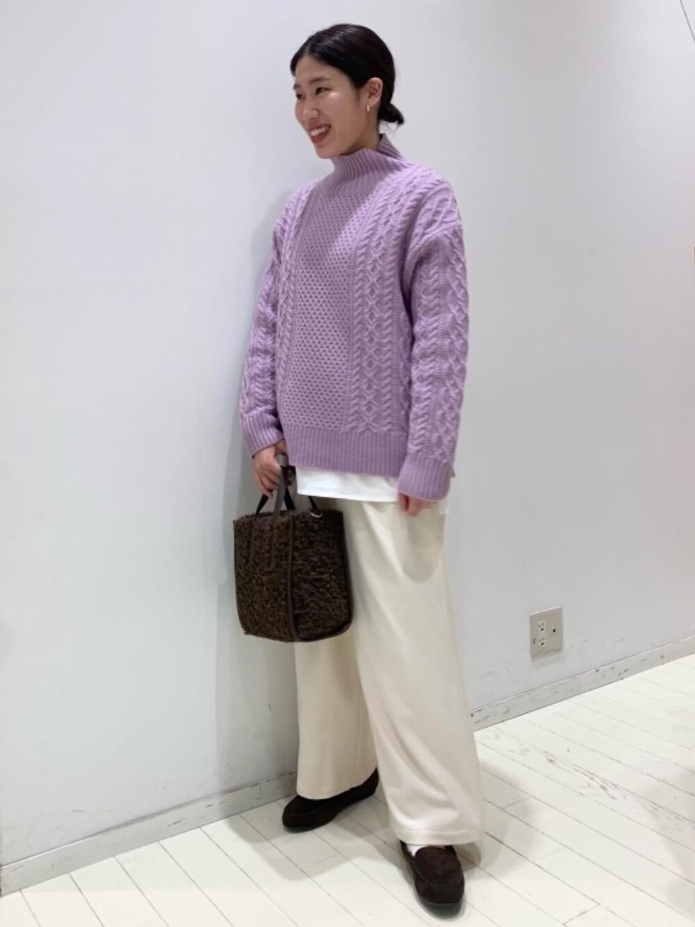 身長:160cm【着用サイズ】ニット(free)インナー(free)パンツ(36)シューズ(L)新色のハミルトンのニットに、ホワイトとブラウンを合わせました。