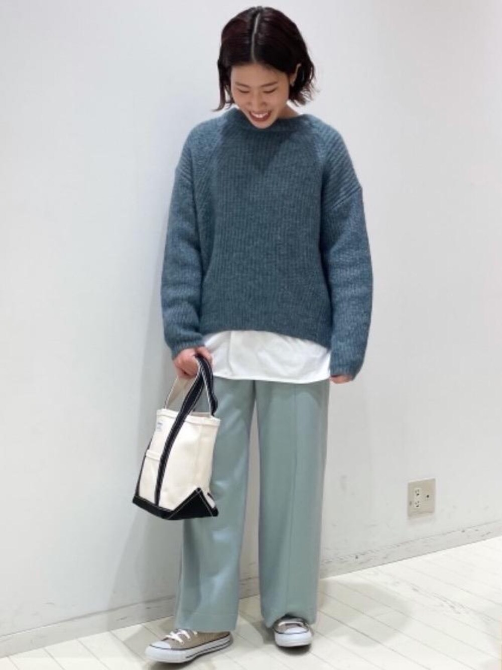 身長:160cm【着用サイズ】ニット(free)インナー(free)パンツ(36)シューズ(24cm) 爽やかなブルーでまとめ、ベージュのシューズで全体をしめました。