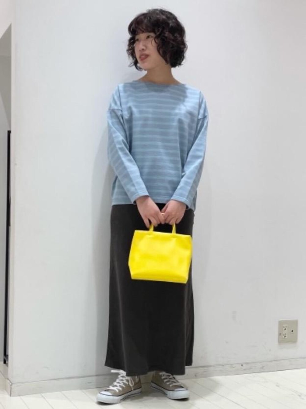 身長:160cm【着用サイズ】トップス(free)スカート(38)スニーカー(24cm) ボーダーとスカート、一見シンプルなコーディネートですが、小物でビビットカラーのイエローを合わせて遊び心をプラスしました。