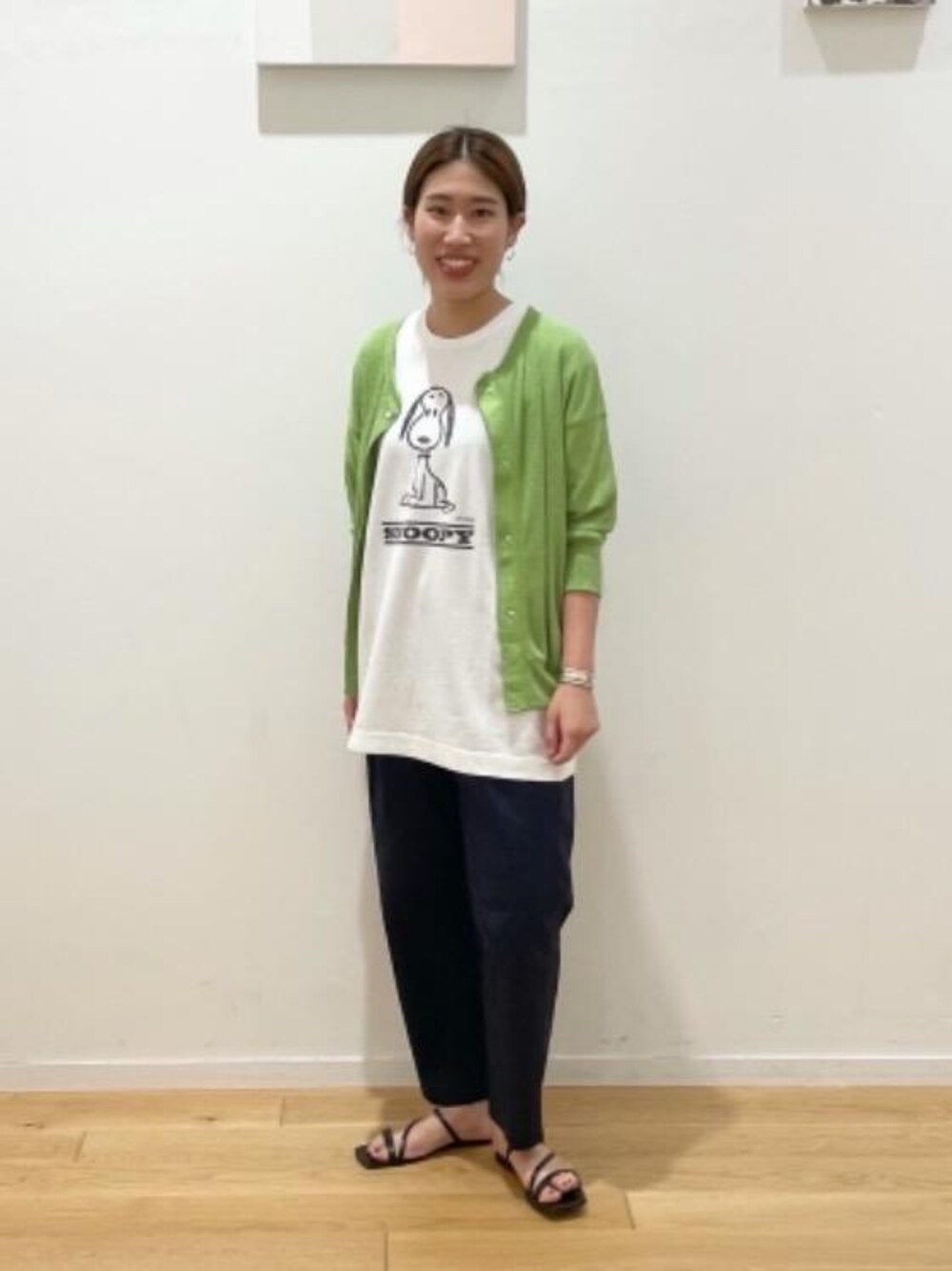 身長160cm 普段サイズ:パンツ38/シューズ24.5 【サイズ感】 カーディガン:標準的 トップス:ゆったりめ パンツ:ややゆったりめ シューズ:標準的 【コーディネートポイント】 色鮮やかなケリーのカーディガンに、スヌーピーのトップスを合わせて遊び心を取り入れました。