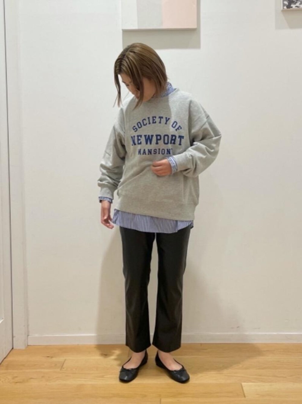 身長:160cm 普段サイズ:パンツ38/シューズ24 【サイズ感】 ブラウス:標準的 スウェット:標準的 パンツ:標準的 シューズ:やや小さめ 【コーディネートポイント】 スウェットの文字の色とブラウスの色を合わせてレイヤードスタイルにしました。