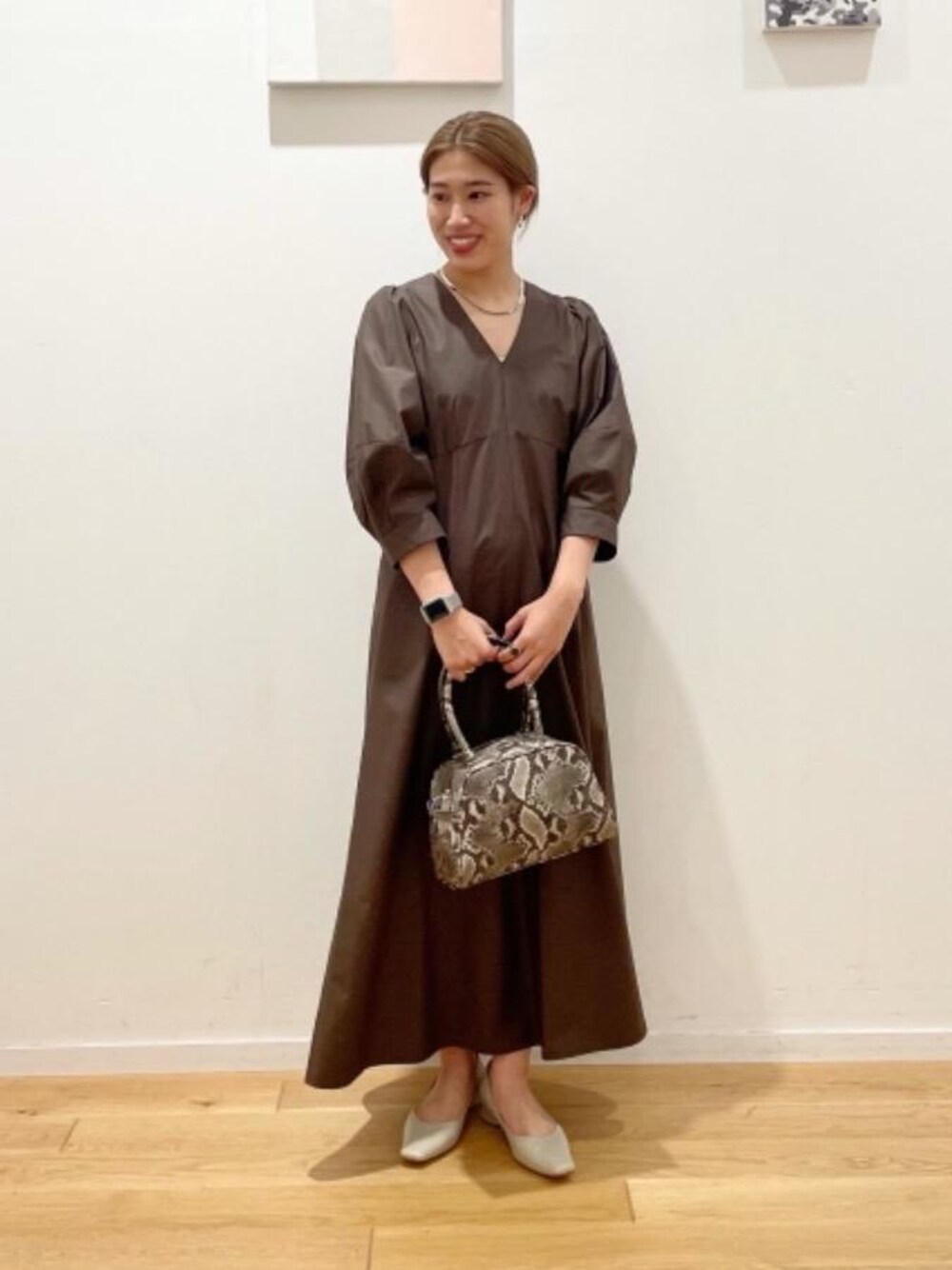 身長:160cm 普段サイズ:シューズ24.5cm 【サイズ感】 ワンピース:標準的(ウエスト周り細身) シューズ:標準的 【コーディネートポイント】 シルエットが綺麗なワンピースを一枚でさらっと着用しました。パイソン柄で遊び心を取り入れました。