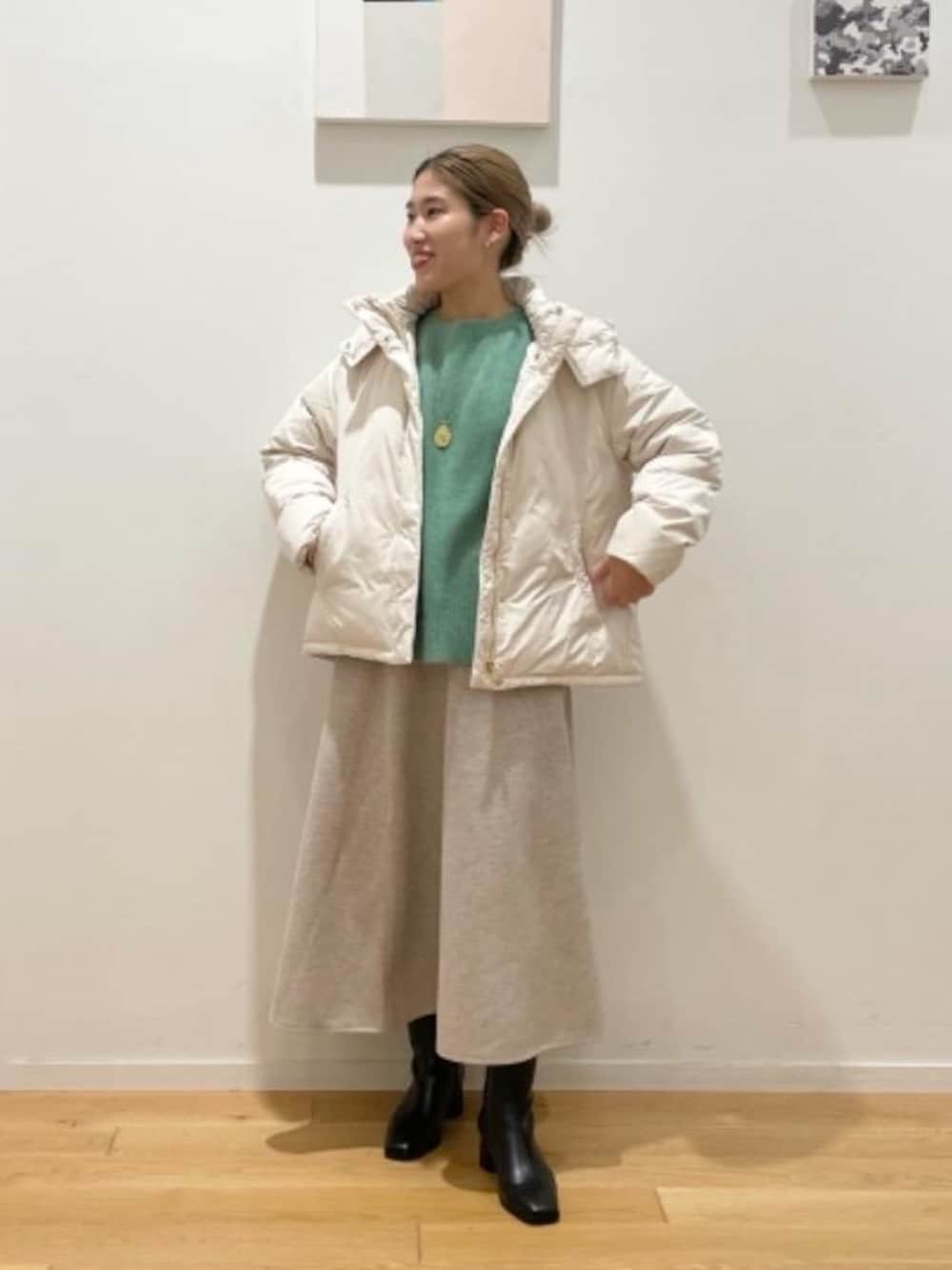 身長:160cm 普段サイズ:アウター36/スカート36/シューズ24.5 【サイズ感】 アウター:ゆったりめ ニット:ゆったりめ スカート:標準的 ブーツ:標準的 【コーディネートポイント】 アウターとスカートの色をホワイト系で合わせました。足元はブラックのブーツで全体を締めました。