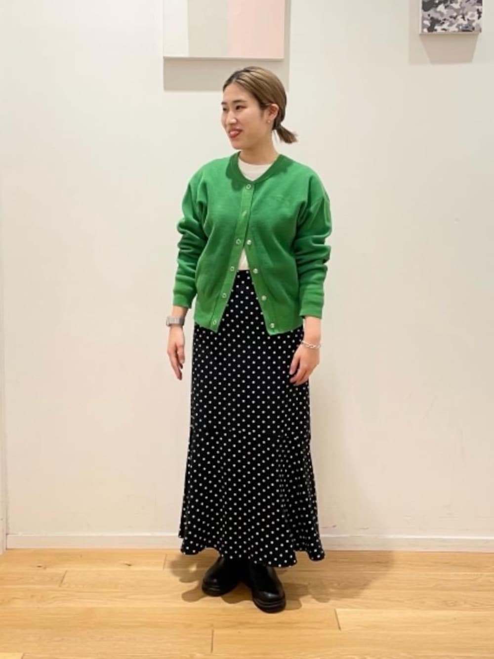 身長:160cm 普段サイズ:ボトムス38/シューズ24.5cm 【サイズ感】 スカート:腰回りややタイトめ カーディガン:ゆったり シューズ:ややおおきめ 【素材感】 スカート:柔らかい カーディガン:柔らかい 【コーディネートポイント】 マーメイドスカートに、アクセントとなるグリーンのカーディガンを合わせました。気分が明るくなります。