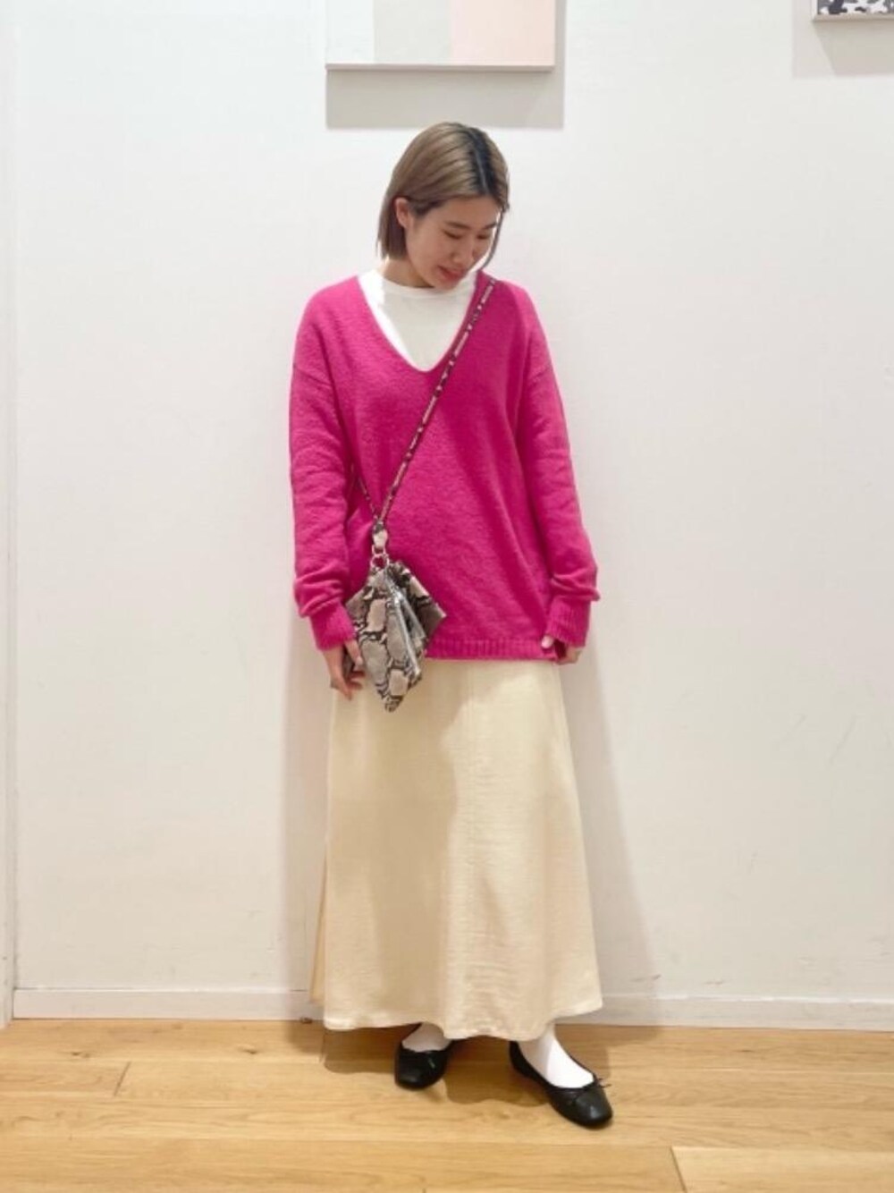 身長:160cm 普段サイズ:ボトムス38/シューズ24.5cm 【サイズ感】 ニット:ゆったりめ インナー:標準的 スカート:ゆったりめ シューズ:標準的 【素材感】 ニット:柔らかい インナー:柔らかい スカート:柔らかい 【コーディネートポイント】 ピンク×ホワイトにパイソン柄のバッグを合わせて遊び心をプラスしました。