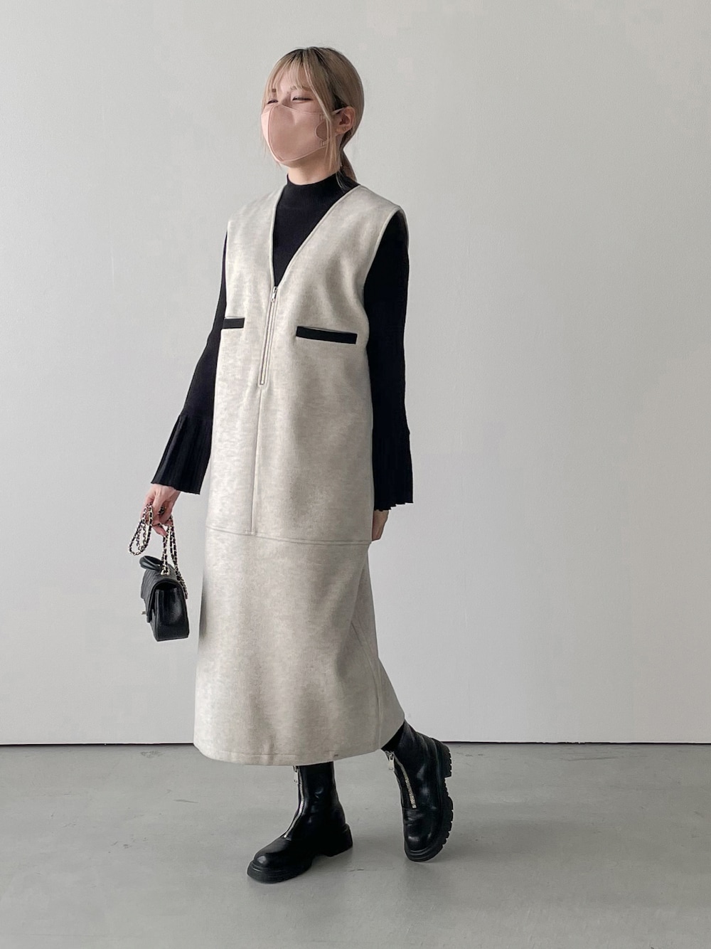 今日もご覧頂きありがとうございます( ¨̮ ) . .. ... あたたかなウール混素材を使った、 大人な女性の雰囲気を演出してくれる ジャンパースカート。 深めのVネック+ハーフジップデザインで すっきりこなれ感のあるスタイリングに◎