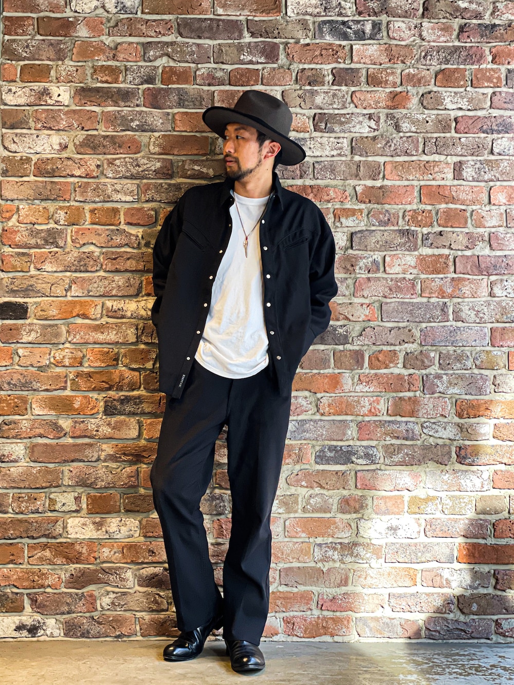 Schott×Wrangler シャツとパンツのセットアップ。パンツは控えめなフレアでクセが無く着回しやすいアイテムです。