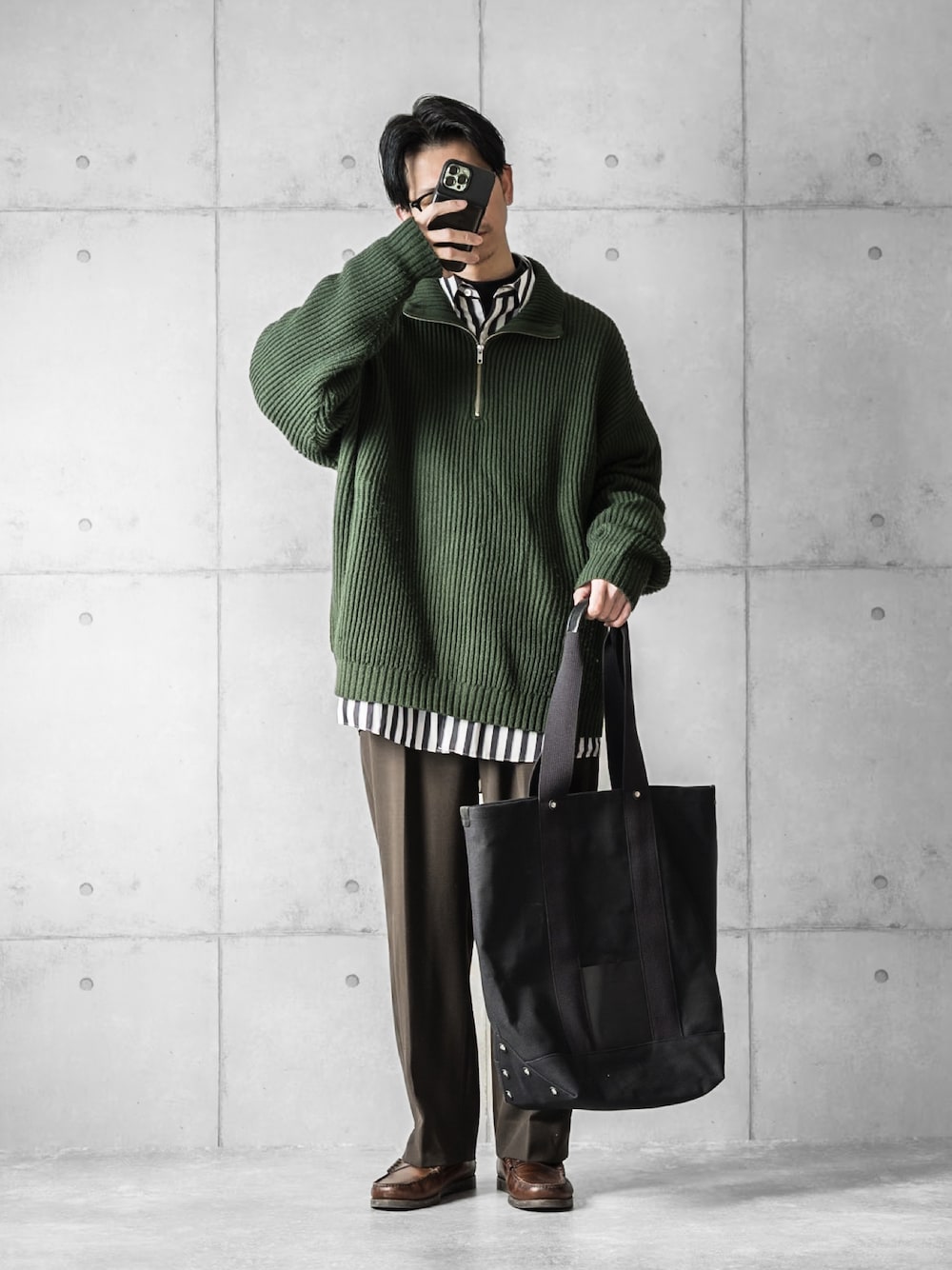しゅんたろーのニット/セーター「WEB限定 ビッグシルエット 畔編み ハーフジップニット/ルーズフィット」を使ったコーディネート