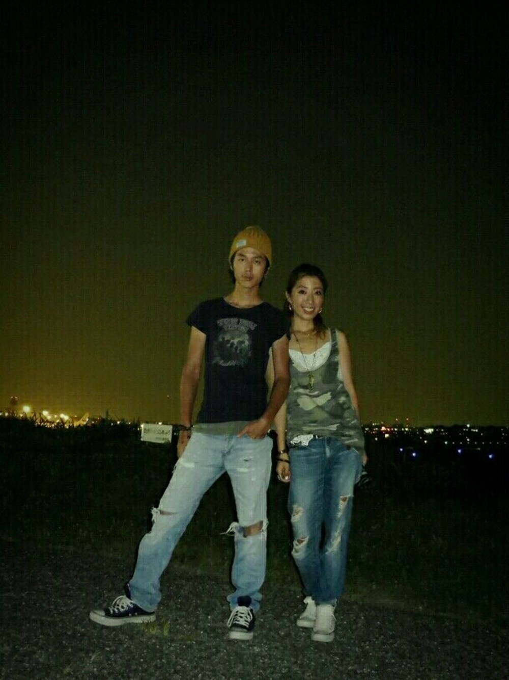 昨日の二人のコーデです👖✨ 昨日のコーデはダメージデニムとコンバースとカーキ色を旦那と合わせてました✨ 後ろは空港の滑走路です✨