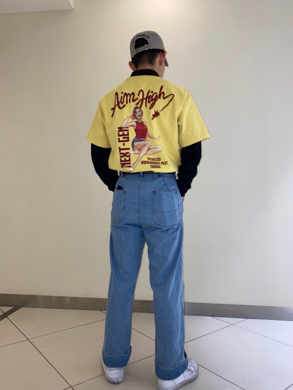 可愛いロゴの黄色Tです^_^ スタッフ身長: 170cm 【着用サイズ】 帽子: FREE トップス: XL パンツ: M