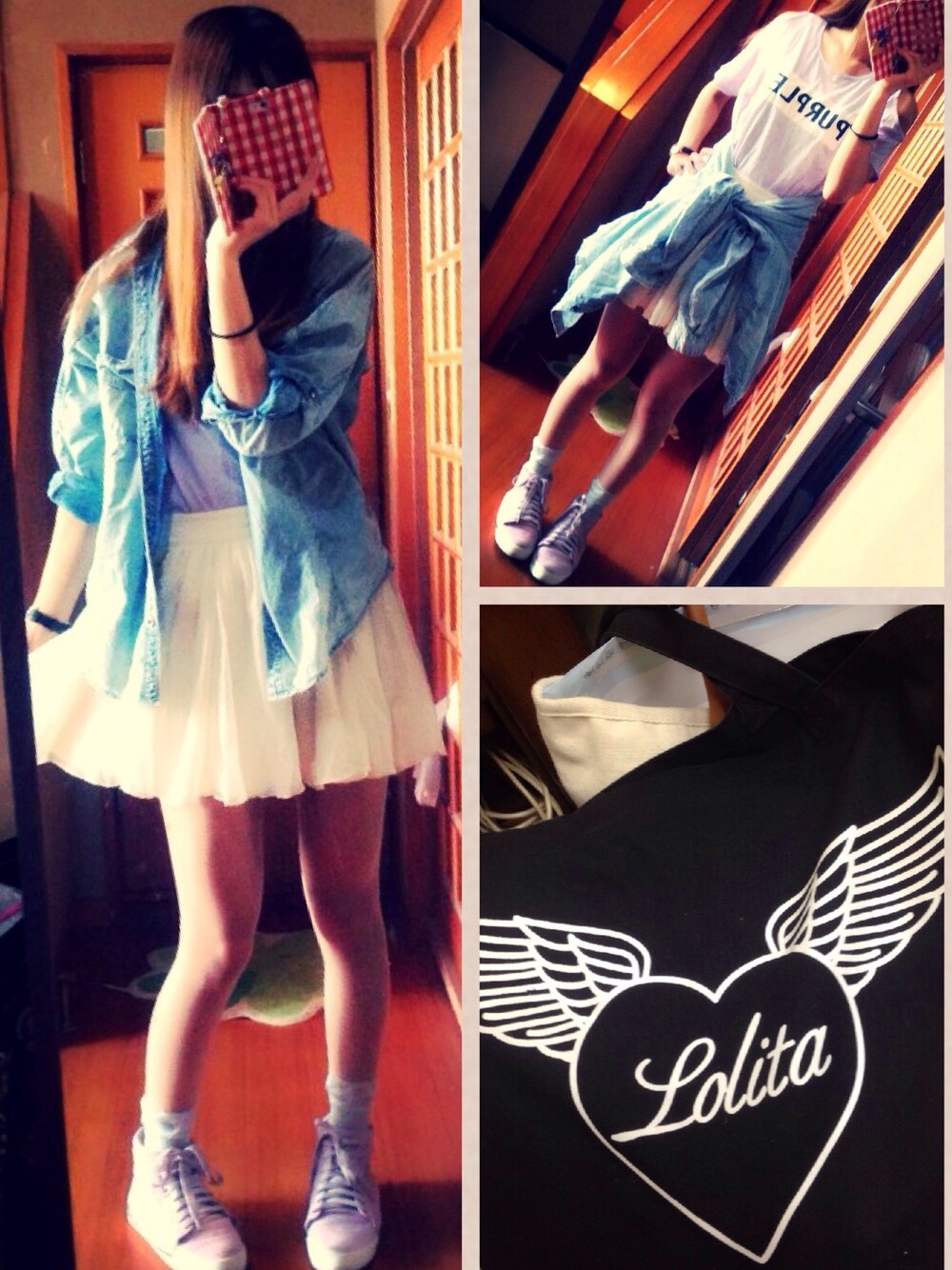 ホワイト系のスカート、ブラック系のトートバッグ、パープル系のスニーカーを着用したレディースの春コーディネートの1枚目の写真