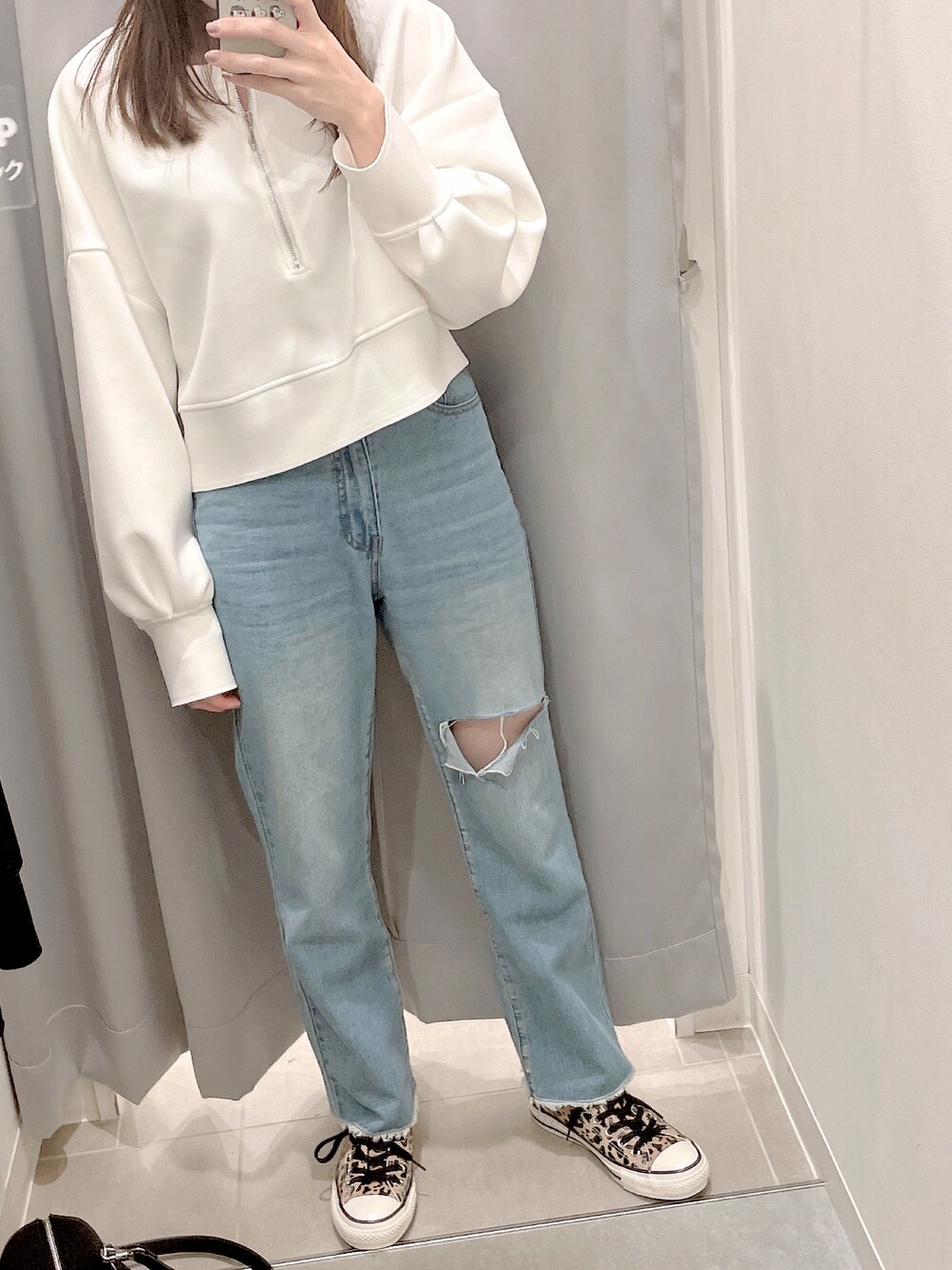 暖かくなってきたので ダメージで肌見せしてみました🌸 ダメージ部分だけ少し寒かったです笑 ハーフZIPで流行を抑えつつ らくちんコーデにしてみました! レオパード柄のコンバースが映えるように🐯