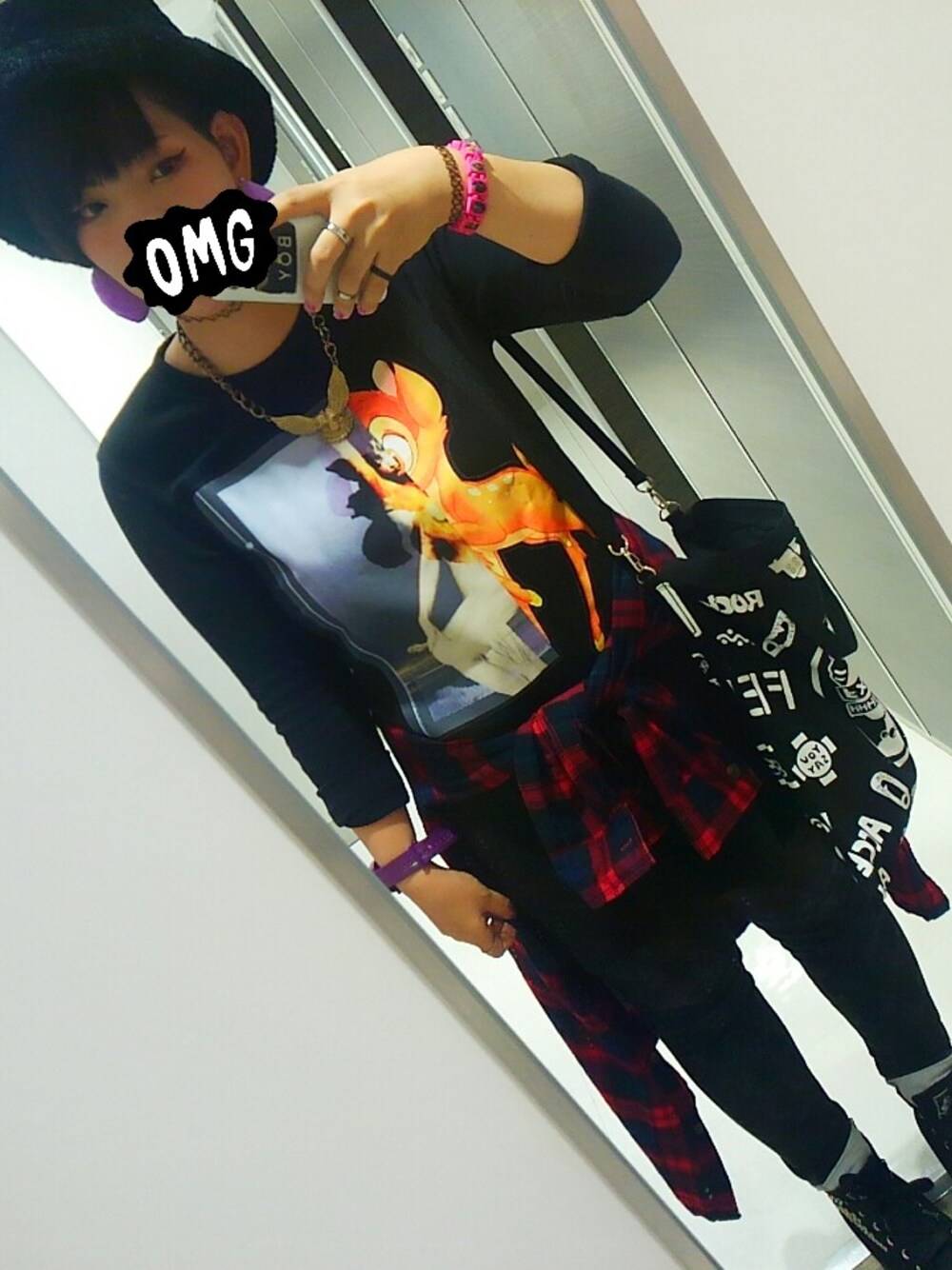 今日もブラック多めコーデ👚👒👖 黒着てると凄く落ち着く。笑 カットソーのプリント(どこかで見覚えが。笑) とアクセでポイントに💕💕 最近小物はファーがMYブーム😘💕