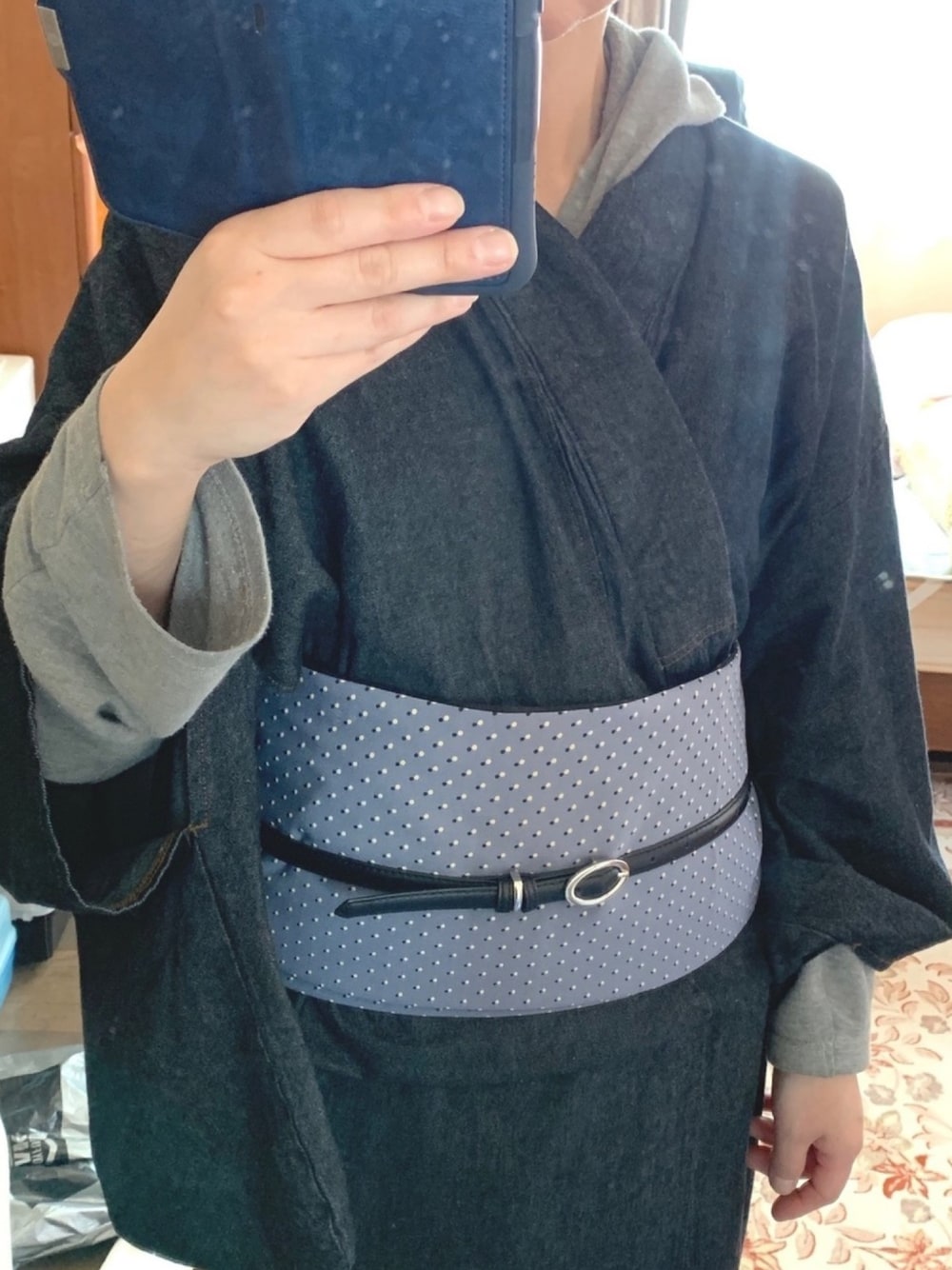 4/3(水)のコーデ 体調が良くないので、ゆるっとコーデ。 長襦袢の代わりにパーカー 毎度の事ながら、腰痛コルセット代わりに帯 安定の?デニム着物