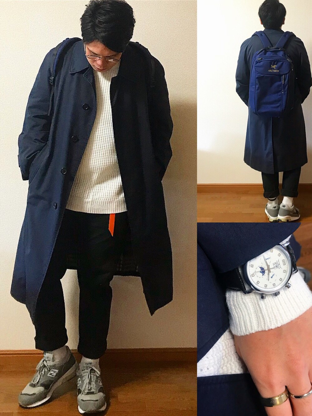 Burberry コート ・ GU ニット ・ エンダースキーマ ベルト ・ GU 黒パンツ ・ ニューバランス1500 ・ ジャラガー 腕時計 ・ 眼鏡 ・ アークテリクス バックパック