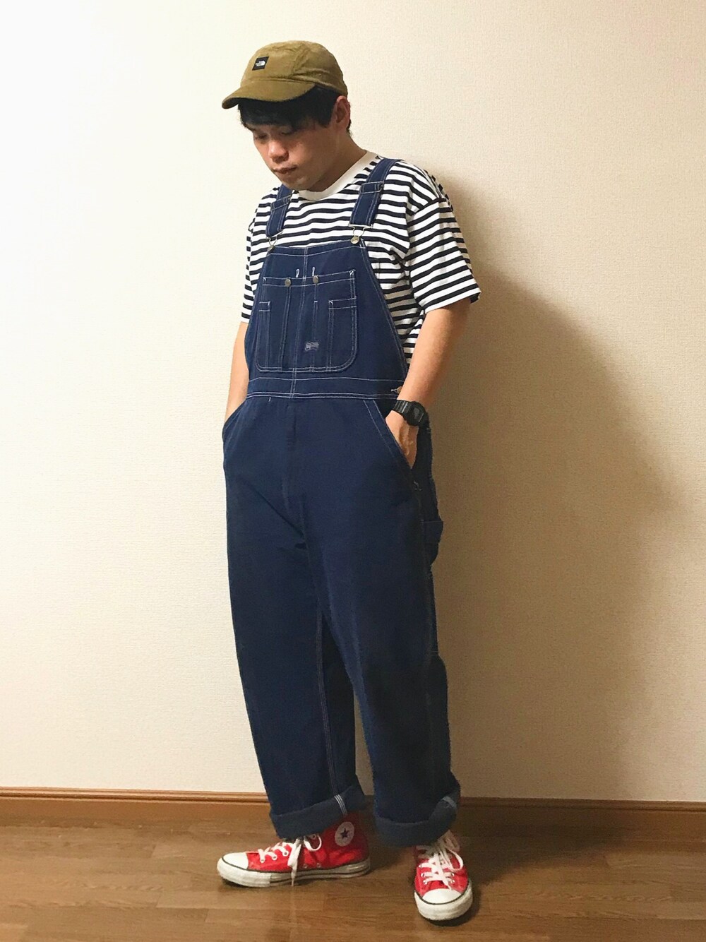 ノースフェイス キャップ ・ UNIQLO ボーダーT ・ 古着 BIG Smith オーバーオール ・ コンバース ハイカット ・ G-SHOCK 腕時計 ・ オーバーオール無性に着たくなる時があります👖