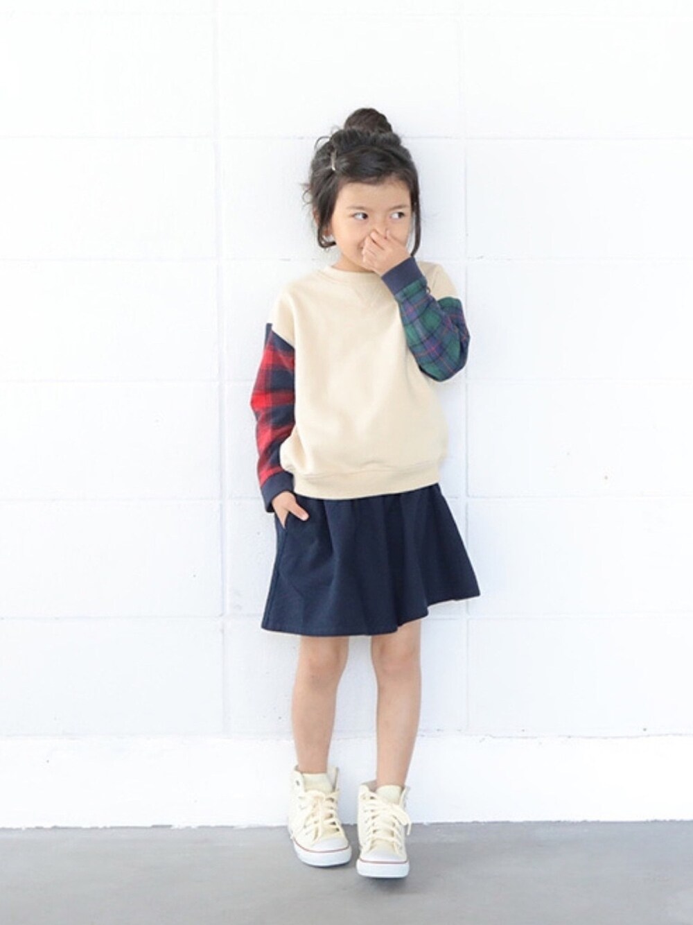 見てくださりありがとうございます☺︎ ヴィンテージ感のある、右と左で生地が違う変わったトレーナーを使ったコーデをご紹介😍 ボトムは落ち着いたネイビーカラーのキュロットを合わせて、ハイカットのスニーカーでカジュアルに𓈒 𓂂𓏸 model:114cm / 110 size 着用 Instagram▷▶︎▷▶︎@t2_sakura8 (着用アイテムの所にリンク画像もありますので、そこからも飛べます✈︎)