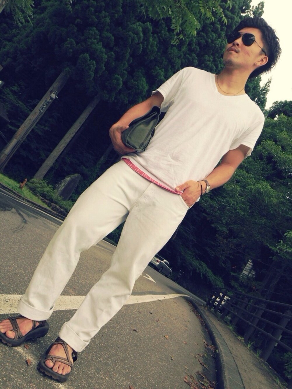 all used all non brand tops:? inner:tank top pants:levis 501 sandle:chaco sungress:ray-ban 秋田旅行3日目のコーデでした!! 初のホワイトコーデ!! sandleは茶系でしたがw それに合わせてinnerのtank topに気持〜ち近そうな総柄の赤をチラ見せで合わせてみました。 んで、相変わらず愛用のミリタリーのセカバン。 この白teeがまたお気に入りで、usedでv neckのはなかなか見なく即買いしたもの。 そのことによってやっとホワイトコーデが実現できたというわけです。 最近自分なんかのcodeをsaveしてくれる方がいて嬉しい限りです。 ありがとうございます!! また撮ったらcodeupします。