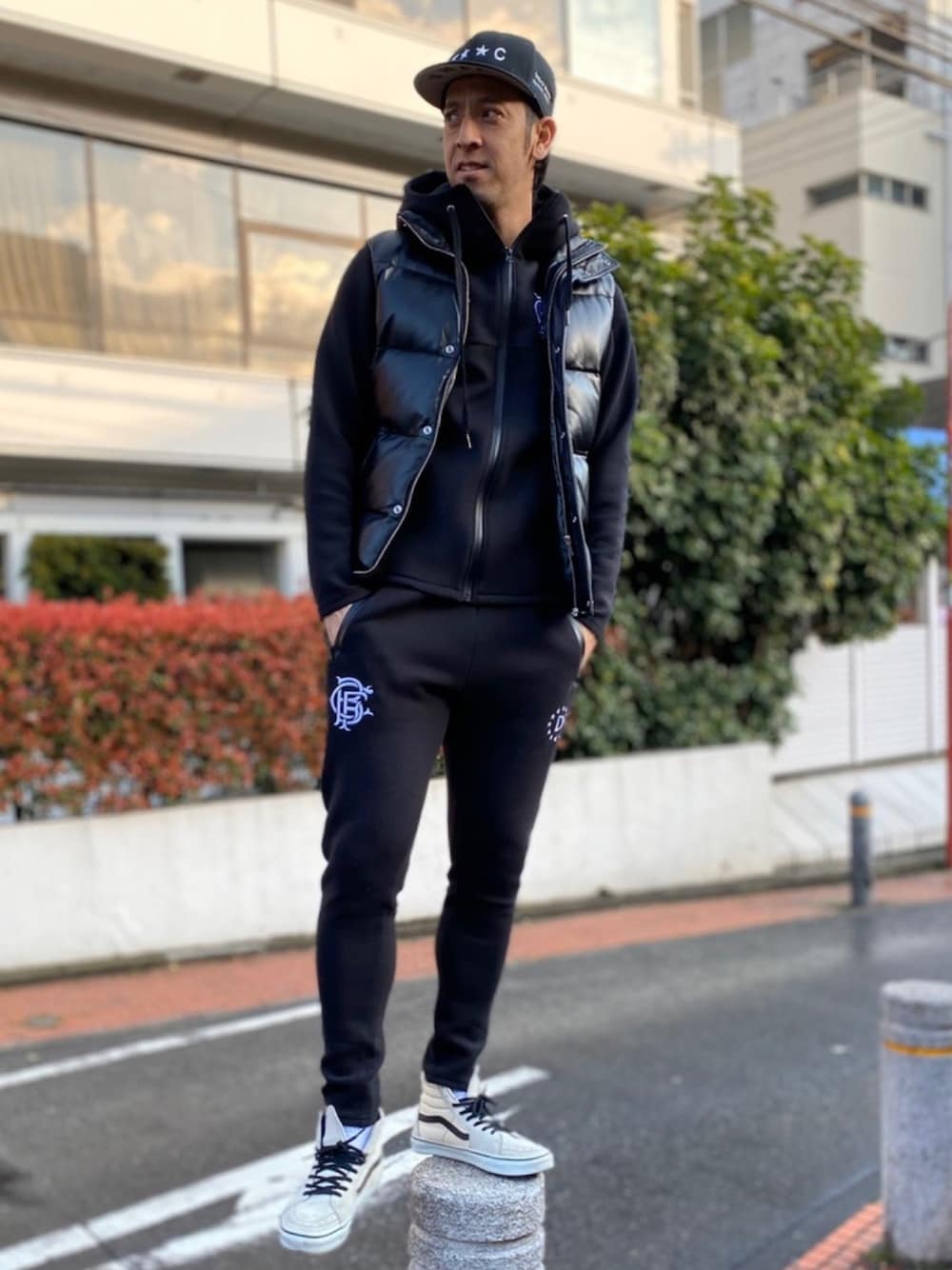 "スポーティ" [アイテム] キャップ@tmfc ダウンベスト@ala スウェット上下@buena vista スニーカー@vans