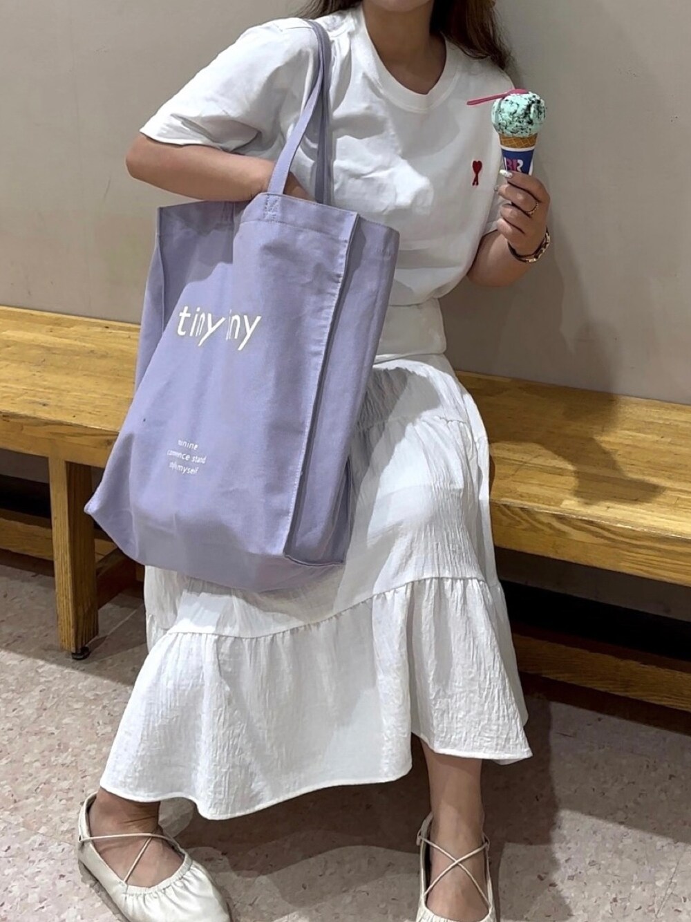 シンプルな服装の時に 差し色でカラーのトートバッグ🛍️ A4サイズや推しのうちわ、パソコンも マチが広いからすっぽり余裕で入る💭
