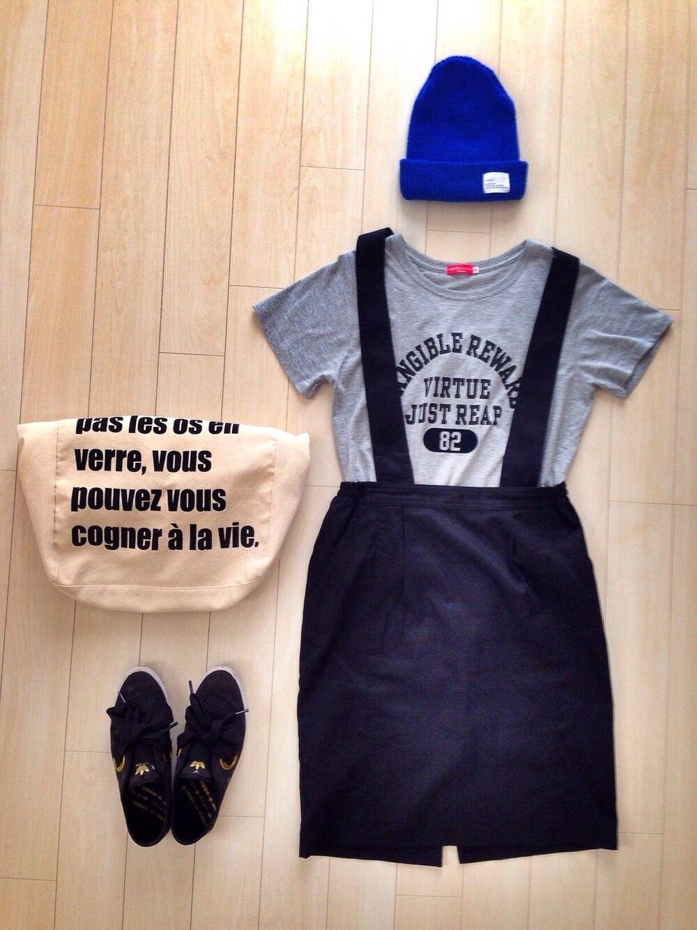 Tシャツ/earth music&ecology スカート/ブランド不明 バッグ/LOWRYSFARM スニーカー/adidas ニットキャップ/RAGEBLUE