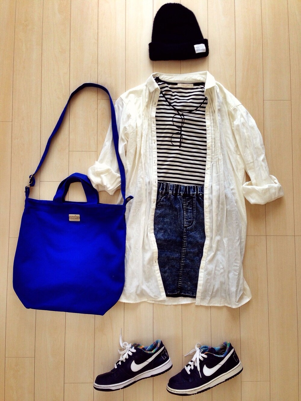 Tシャツ/Green Parks スカート/jeanasis シャツワンピ/ブランド不明 スニーカー/NIKE バッグ/patagonia ニットキャップ/RAGEBLUE