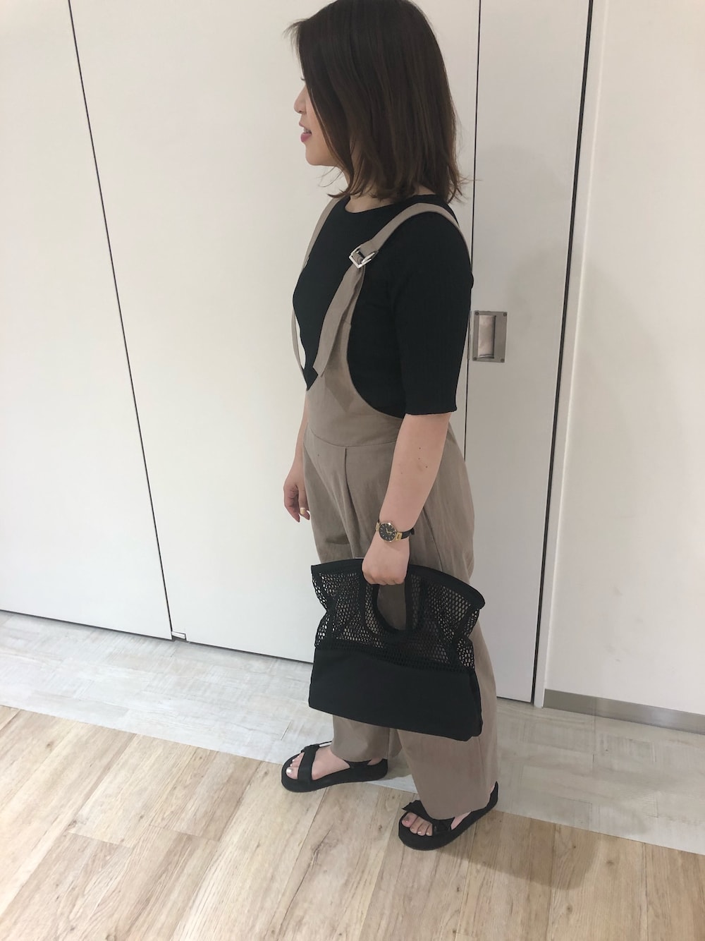 人気のアースカラーのサロペットに、 ブラックのトップスで締まりのある コーディネイトです☺️
