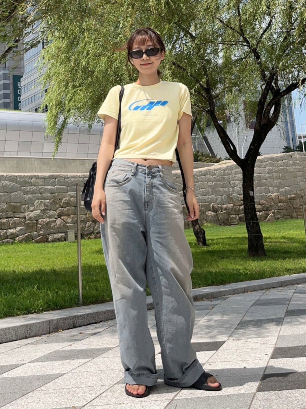 イエロー系のTシャツ/カットソー、ブルー系のデニムパンツを着用したレディースの夏コーディネートの1枚目の写真