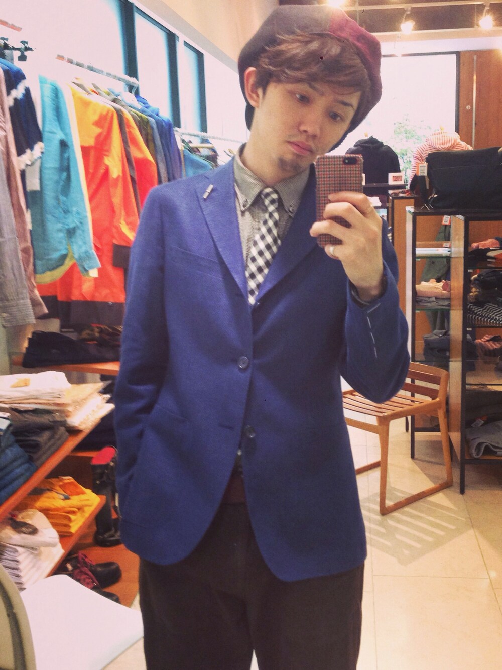 ブルー系のテーラードジャケットを着用したメンズの春コーディネートの1枚目の写真