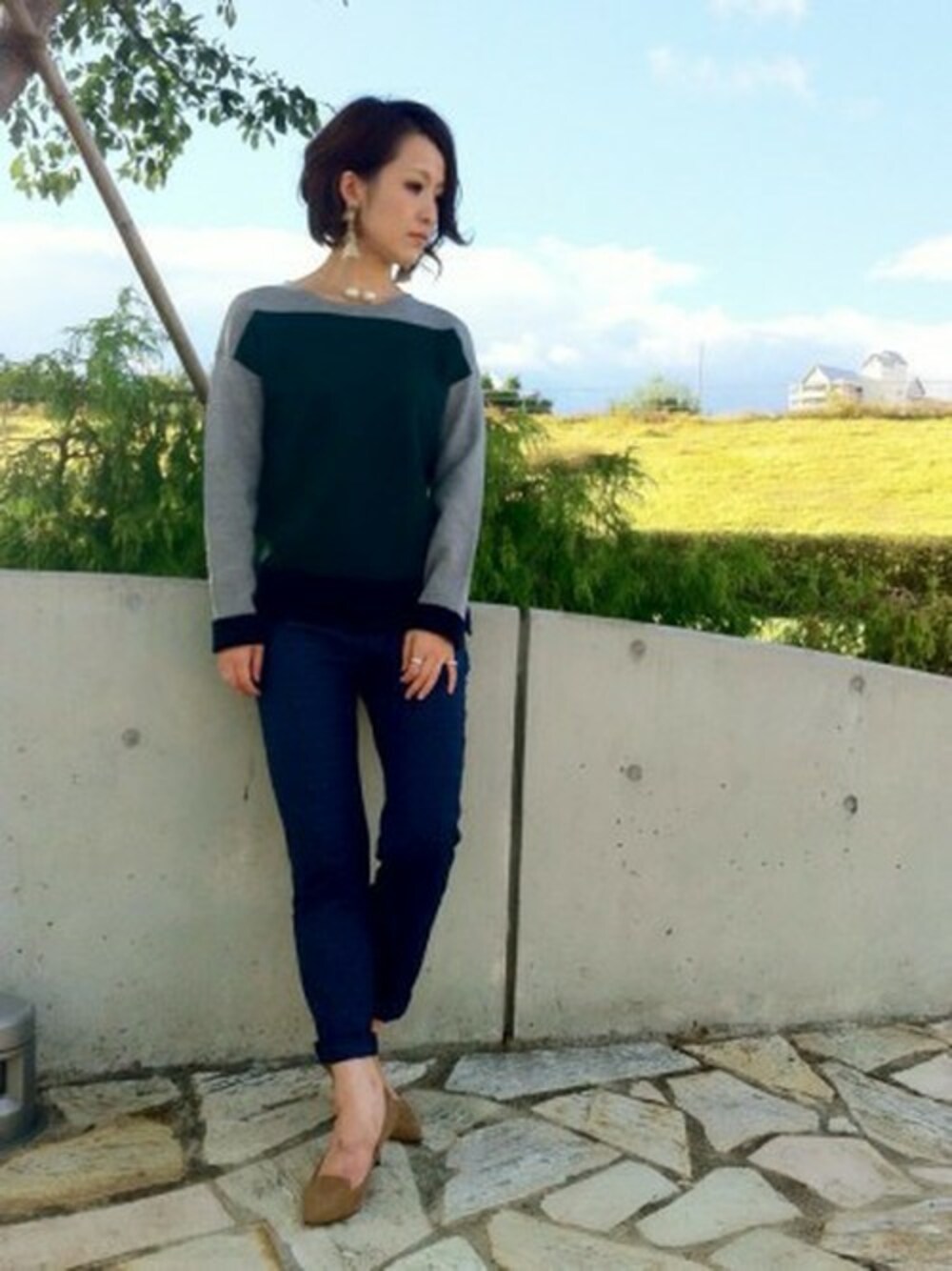 VERY 掲載商品のコンビカラープルオーバーのご紹介です。 バイカラーの配色がおしゃれなニットトップス。ベーシックなカラーに 秋冬らしい深みのあるグリーンの配色をチョイスしてみました。