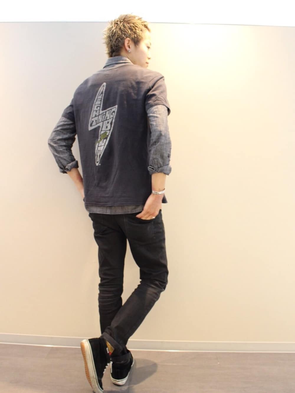 全体は黒でまとめて デニムシャツやらスウェードスニーカーなど使って素材を変えてみました!