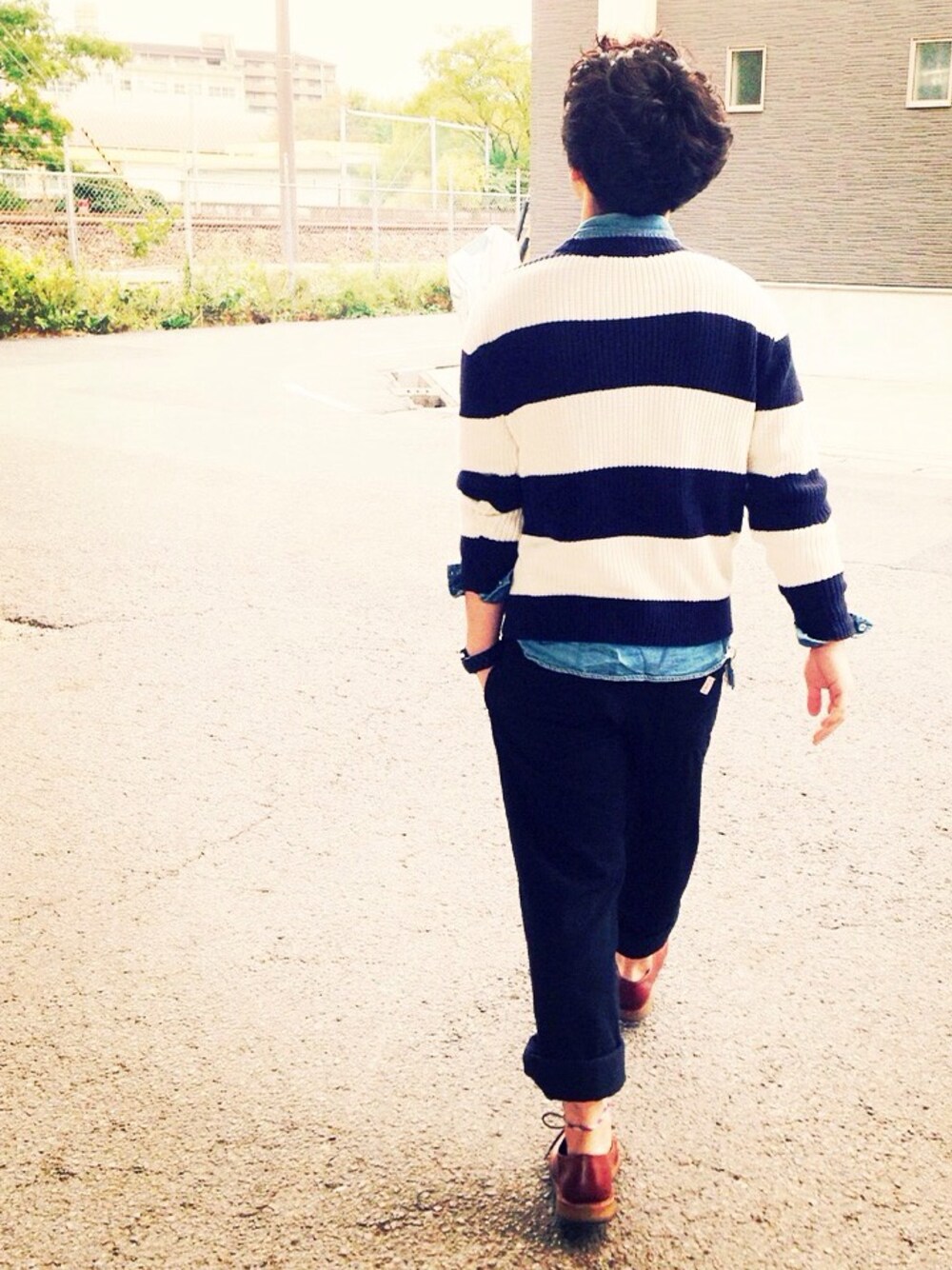 ニット/nico and... デニムシャツ/unknown パンツ/Danton 短靴/Paladin 囚人ニット。 ニットを楽しめる季節になって嬉しい。