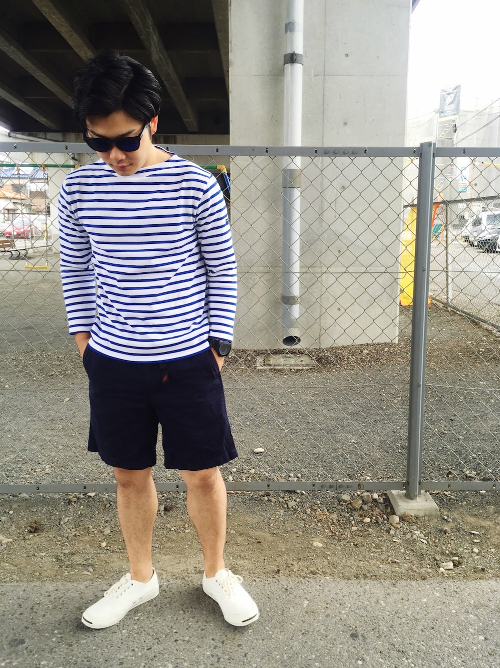 バスクシャツ/SAINT JAMES ショーツ/Gramicci サングラス/Oakley シンプルに。