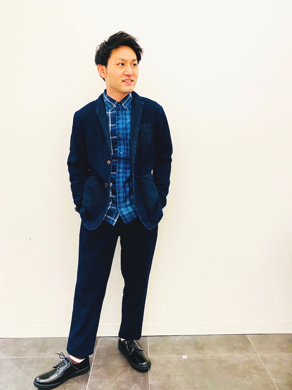 👕ファッションスナップ👕 ネイビーコーディネート。 藍染をしているセットアップなので経年変化で雰囲気も変わる。 良いものを長く着て味を出すのも愛着が湧くからいいですよねー!
