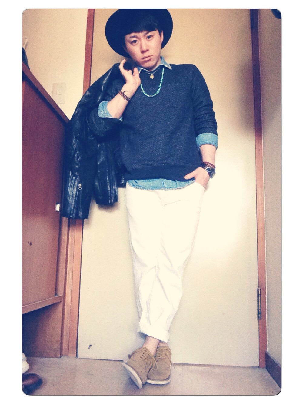 春とは言えまだ夜は寒いからレザーJKTで防風対策を....☻ 全体的にシンプルだから小物類でコーデに彩りを♪