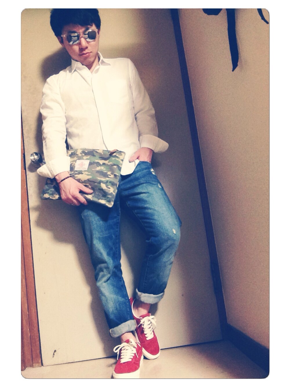 白シャツ×デニムのシンプル黄金コーデに赤いスニーカーとカモフラクラッチで遊び心を持たせて☻