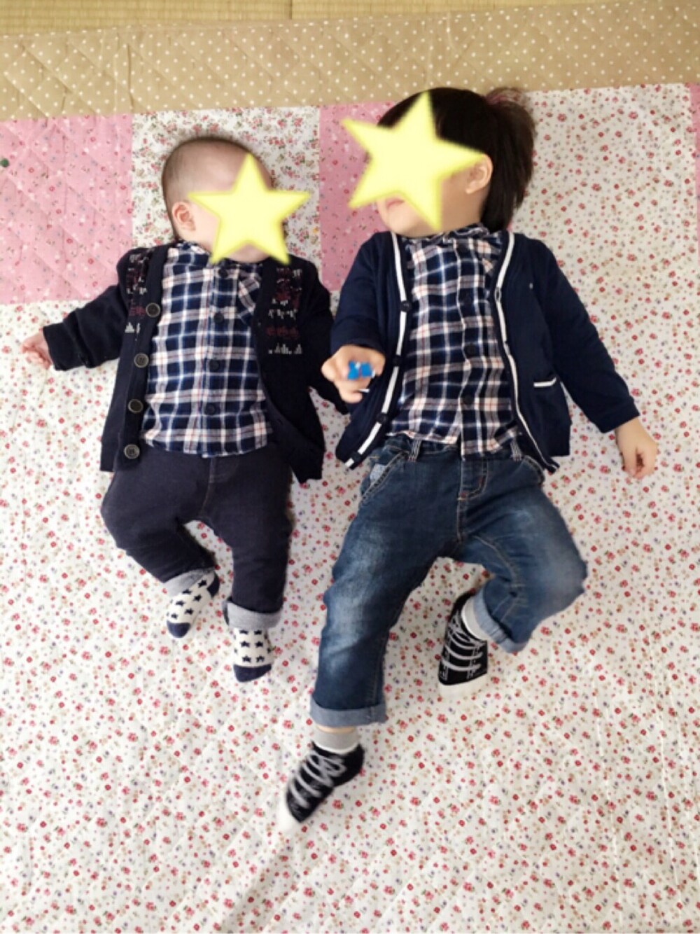 今日の兄弟code…♪ シャツ×カーディガンこーで。 全体的にネイビーでまとめてみました〜。 西松屋お洋服多し。 安くないと、おそろで揃えられなーい。 またもや昨日から寒くて寒くて、冬に逆戻り〜な感じね。 もう3月なるし、このまま春になるのかなー なんて思ってたのに 東北はまだまだ雪が降るようです〜。 早く薄着でお出かけしたいわ〜。 でも春は春で、花粉の季節…私は嫌いな季節かも〜。 よく妊娠や出産で体質変わって、花粉症楽になったー!とか、聞くけど 私は更にひどくなっちゃったパターン。 年中鼻炎+花粉症はツライぜ。。。