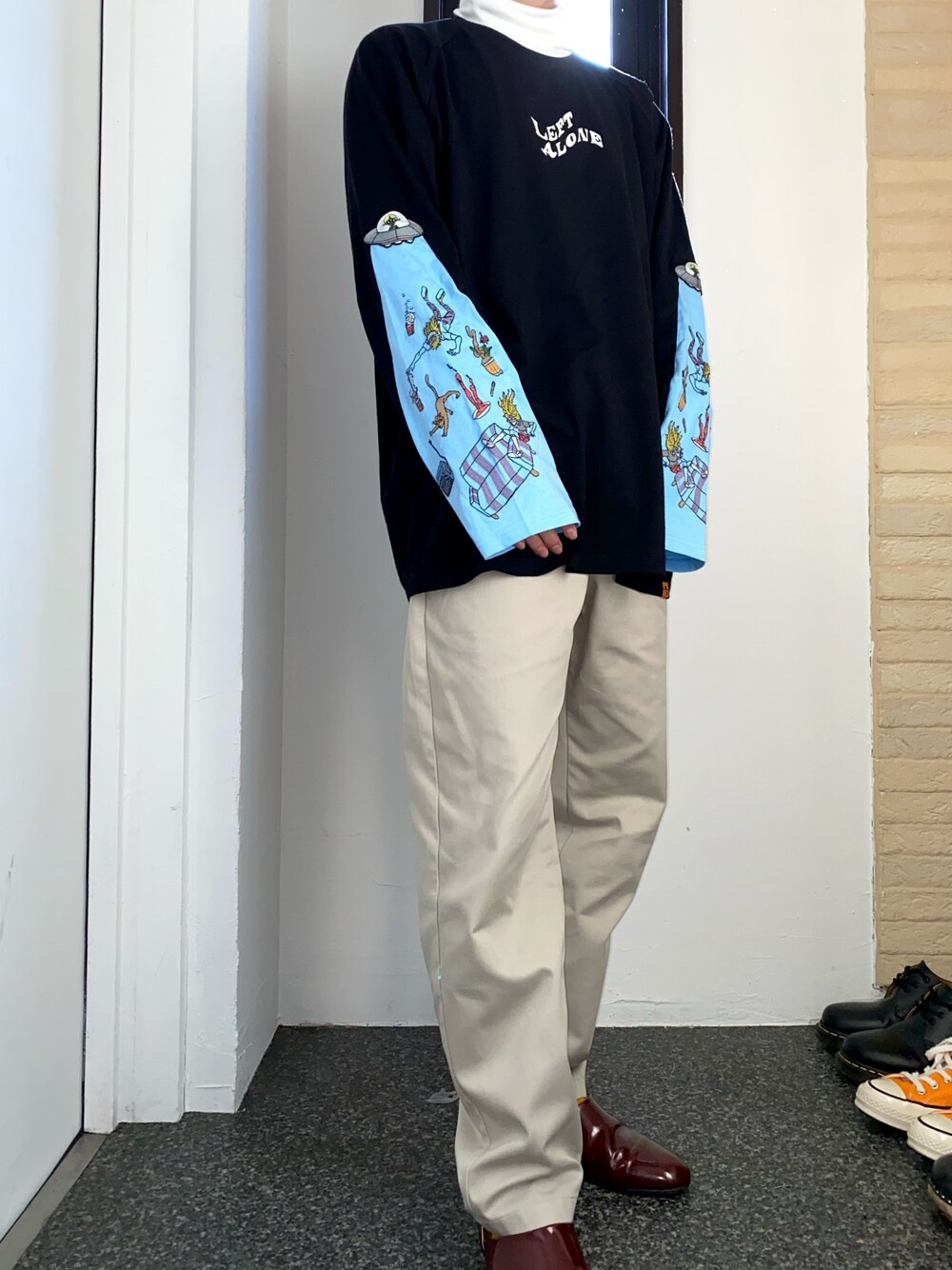 見てくださりありがとうございます☺︎ 良かったらいいね、お気に入りフォローお願いします🙇♂️ leftaloneの新作🙋 パンツはGUのシェフパンツ👨🍳