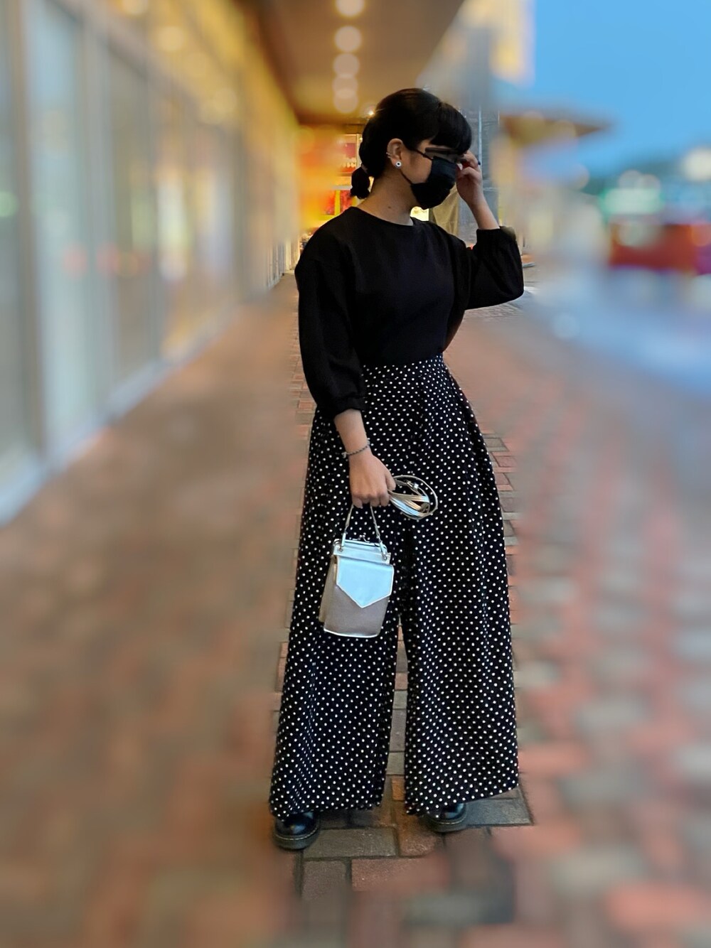 雨の日コーデ☔️ レインブーツ持ってないので 雨の日はDr.Martensが大活躍です✌🏻 オールブラックコーデでも 柄があるだけで暗く重たくなりすぎない カジュアルなコーデになりますね☺️☺️ 実は骨格ウェーブの方は 華奢で可愛らしい印象の方が多いので 小花柄や細かいドットなど 小さな柄はとても相性がいいんです◎◎