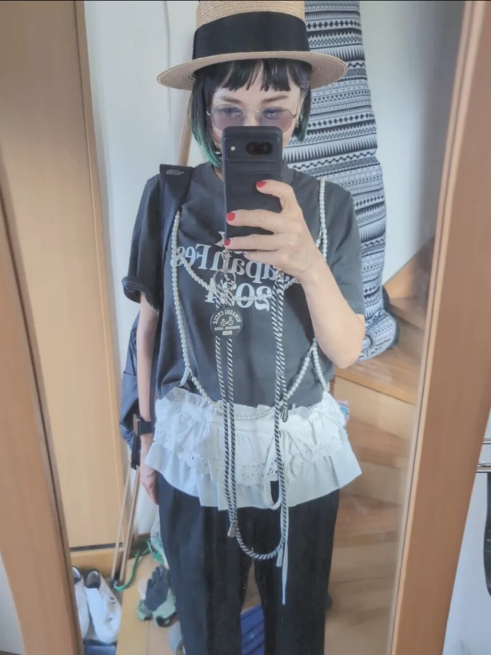 パールのサスペンダーや小物を使ったコーデ