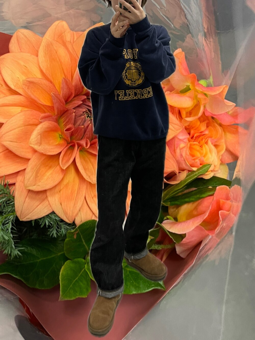 背景をお花にしたがためになかなかのださっぷり^_^ トレーナーは古着!