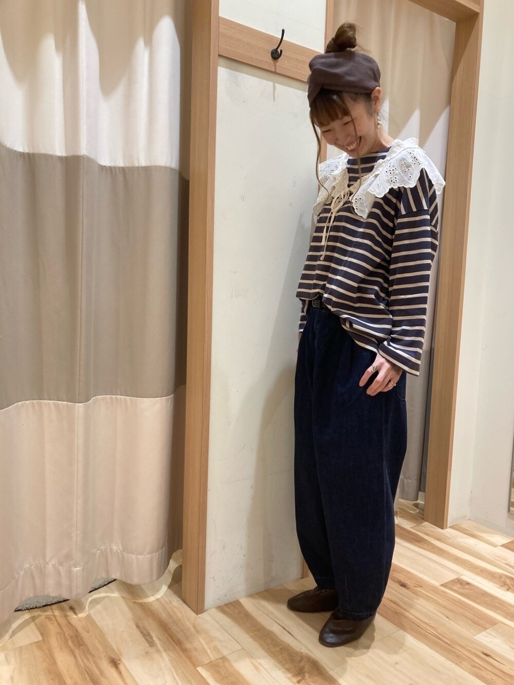 おはようございます☺️🌼 本日もご覧いただき、ありがとうございます✨ 本日は となみで大人気アイテム✨コクーンデニムパンツを使ったコーデです🌼 しっかりとしたボリューム感はトップス悩みいらずです👍 シャツでも、カットソーでも、何にでも合う優秀なパンツ👏✨ 今回は着心地柔らか、ゆるっとバスクボーダーシャツに合わせたナチュラルスタイル♫ シンプルなコーデにつけ襟で甘さをプラス💕 シンプルなコーデの時は何か小物で、自分らしさを出してみて下さいね☺️💕 ヘアバンドもお気に入りの一枚💕 頭の大きい私も痛くなく楽ちんなつけ心地です👍 ノベルティーフェアのご来店、本当にありがとうございます☺️🍁 遠い所からのご来店や、フェア前からの下見に加えて、何回にも分けて参戦して下さったお客様…😭💕 本当にいつもありがとうございます💕 あたたかいとなみのお客様に支えられて、感謝感謝のスタッフ一同です😭 まだノベルティー在庫ございますので、是非お気軽にお立ち寄り下さい🤗💕
