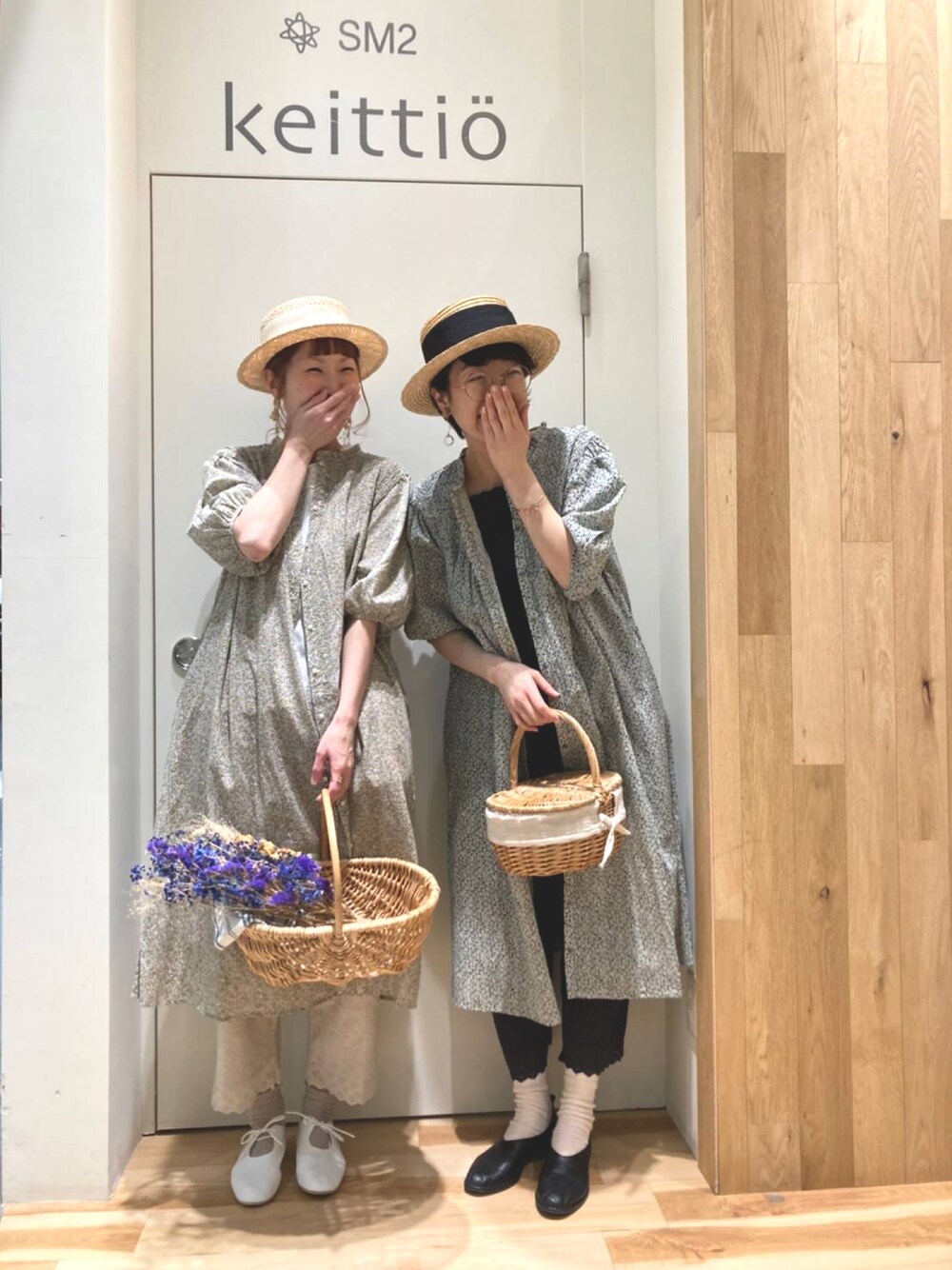おはようございます🍒 本日もご覧頂きありがとうございます🤗✨ こちらはノスタルジックな柄のワンピースを2人で🎵 夏に向けて5分袖アイテム入荷でるんるんな ツクとカク🫧🫧 いきなりツクが目の中何か入ってない?と あっかんべー状態になり、 途中それをカクが再現して いつもの戯れを🎶