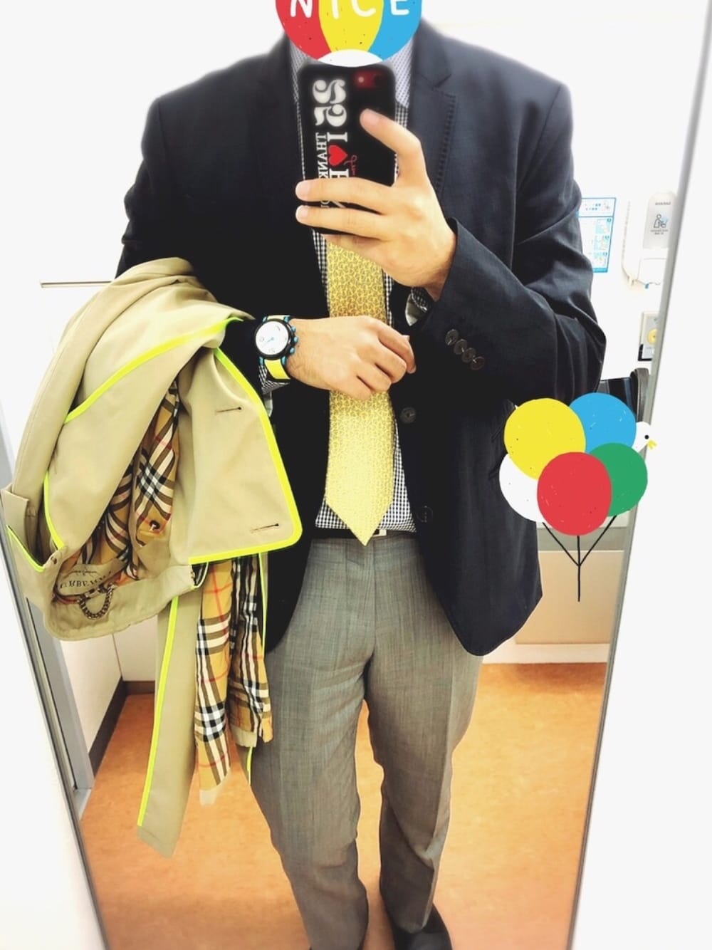 今日は外出のためネクタイです。 ギンガムチェックのシャツに柄ネクタイという、柄✖️柄に挑戦! その分、外見はシンプルにグレーのスラックスに、ネイビーのテーラードジャケット。 時計はネクタイに合わせて黄色のバンドで。 今日は暖かいから、黄色でいいかな!