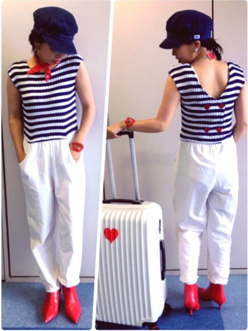 @aileen_by_groggrog_vintage さんにて🌊🚢⚓️💕 一目惚れ😻💗 マリンオールインワン⚓️可愛すぎた😻💕 後ろ姿も可愛いの😍💕 頭には慣れない @leedenimofficial キャスケットに 首には @zara のバンダナチーフ風チョーカー。 足元はこれまた @zara の赤いショートブーツ👠 キメすぎてちと恥ずかしいけどここまで来たら正々堂々と❣️笑笑 ニューヨークだしね🗽🇺🇸