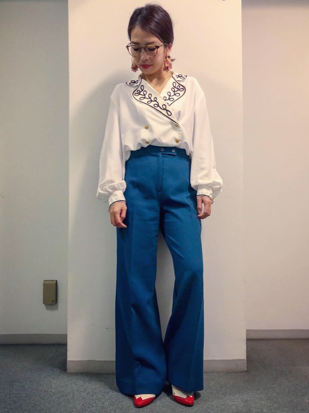 @rainbow_vintage_hrjk さんのインスタでずっと狙ってたこちらのセット。 ずっと行けなくてもう無いかなぁ😭なんて心配しつつ、閉店間際の滑り込みで(ごめんなさい🙇♀️)覗いたら♡ まだあった♡ やーっぱり可愛かったよ😍 パンツの色といいなんと言ってもこのカラーの綺麗さ‼️😍 ブルーグリーン?センタープレスがしっかりかかってかっこいい。 ポケットが無いのが私的残念度100%だが、きっとこの綺麗シルエット保つのには仕方ないの?よね?ね? (服作ってる方教えてください🤓) ブルーにつま先が赤のパンプスで、ここに細めの黄色いベルトがあれば色合わせは完璧だったな🤔 私にしては珍しいこのトップスのルーズさも生地がやらかいから肩もストンと落ちて綺麗だし袖も手首がシュッとなってるからメリハリ感も👌 きちんとインしてもいい感じのやらかさで自然にフワッとなってくれるのも良い💫 ダブルなところも見にくいけどボタンが金ボタンなところもおきにいりだよ😍