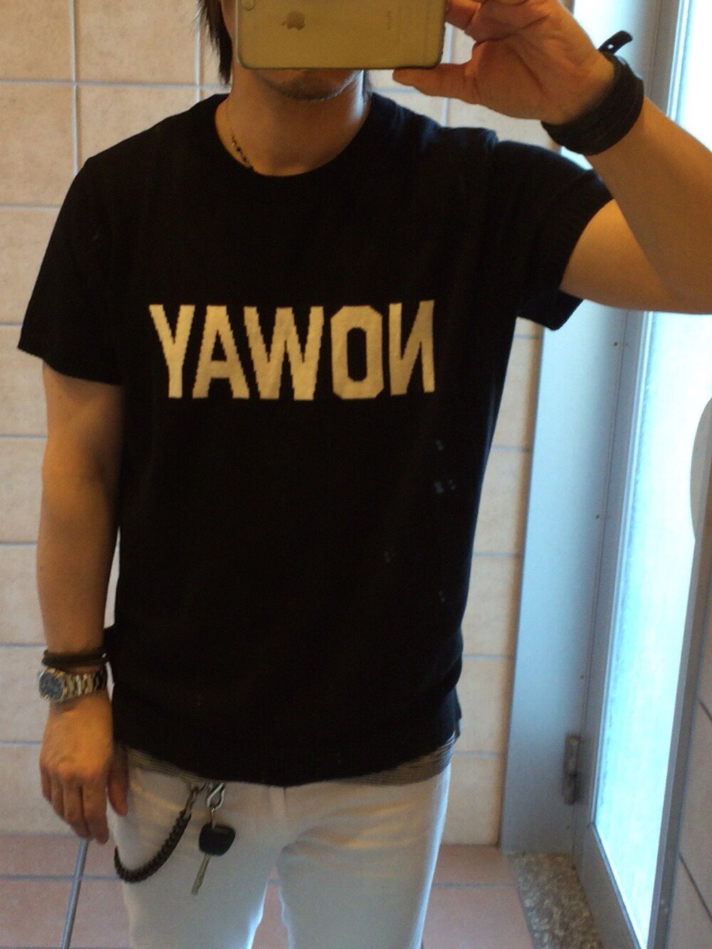 7月頭 暑くなり始めた頃 ラウンジの半袖ニットをシンプルにシロクロコーデで、中に細いピッチのボーダータンクを入れて裾をチラ見せ。 写ってはいないけどスニーカーはナイキAIRMAX90 の黒