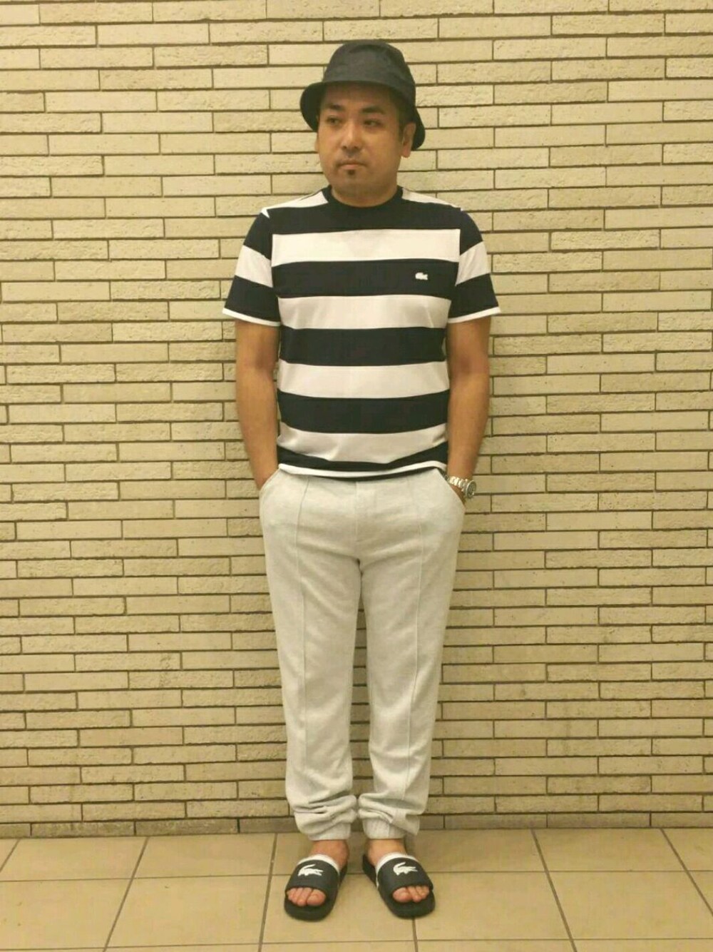 続きまして、、、 スウェットパンツを合わせてみました。 夏はリラックススタイルがすごしやすいです。 シャワーサンダルの大きいワニがインパクト大❗ Tシャツのボーダー柄とシャワーサンダルの相性 も気に入っています。