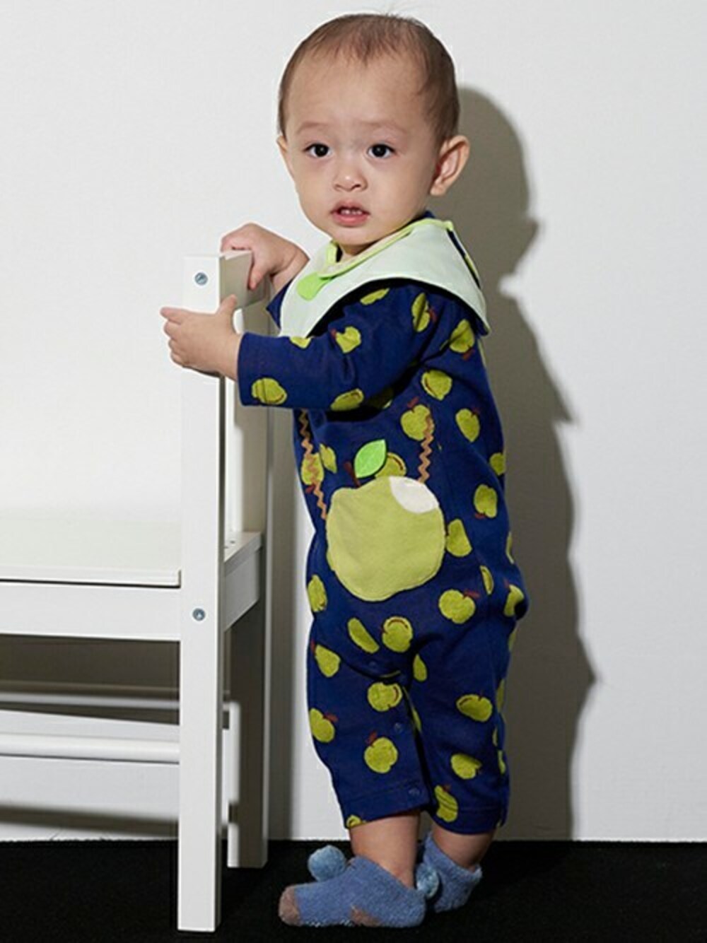 kladskap クレードスコープのロンパース「りんごジャガードカバーオール」を使ったコーディネート